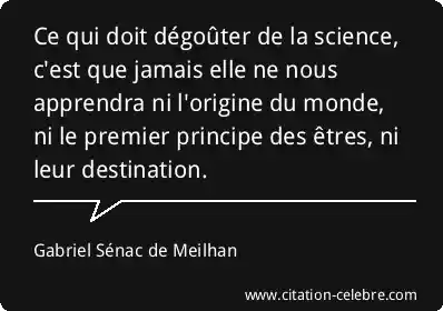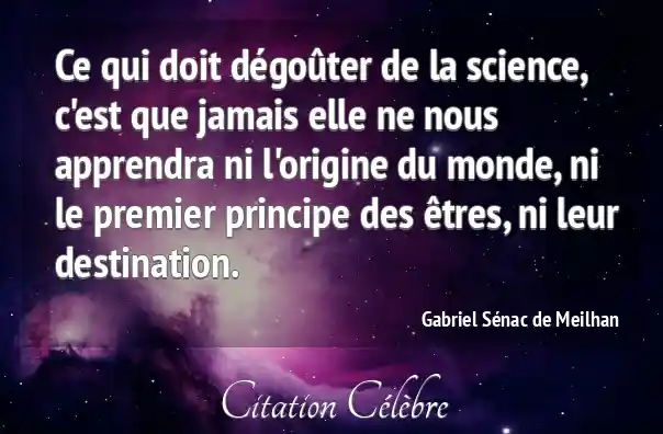 Ce qui doit dégoûter de la science, c'est que jamais elle ne nous apprendra ni l'origine du monde, ni le premier principe des êtres, ni leur destination.