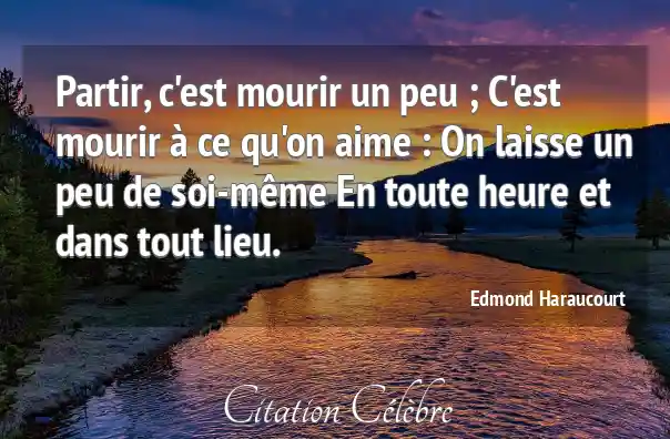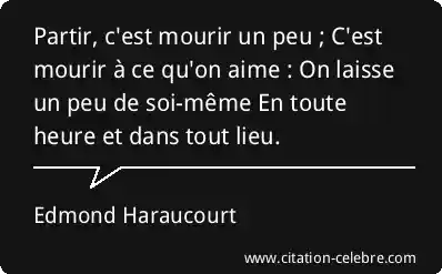 Partir, c'est mourir un peu ; C'est mourir à ce qu'on aime : On laisse un peu de soi-même En toute heure et dans tout lieu.
