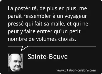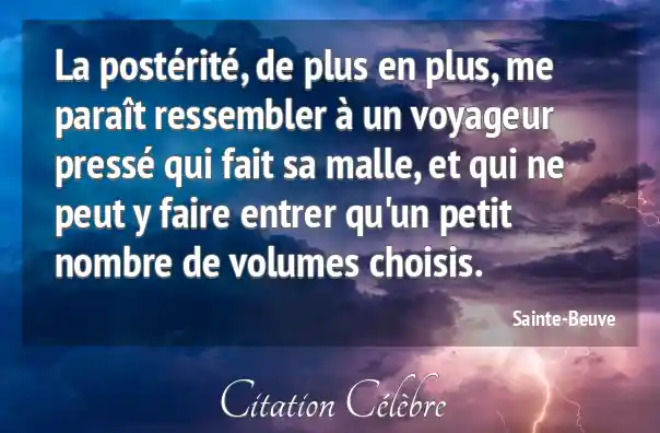 La postérité, de plus en plus, me paraît ressembler à un voyageur pressé qui fait sa malle, et qui ne peut y faire entrer qu'un petit nombre de volumes choisis.