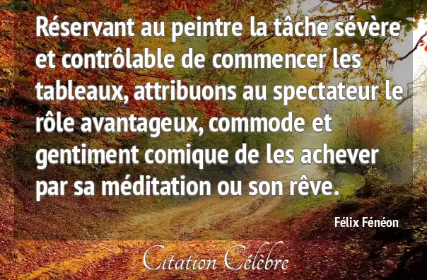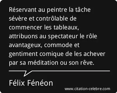 Réservant au peintre la tâche sévère et contrôlable de commencer les tableaux, attribuons au spectateur le rôle avantageux, commode et gentiment comique de les achever par sa méditation ou son rêve.