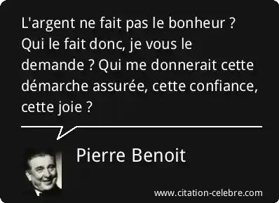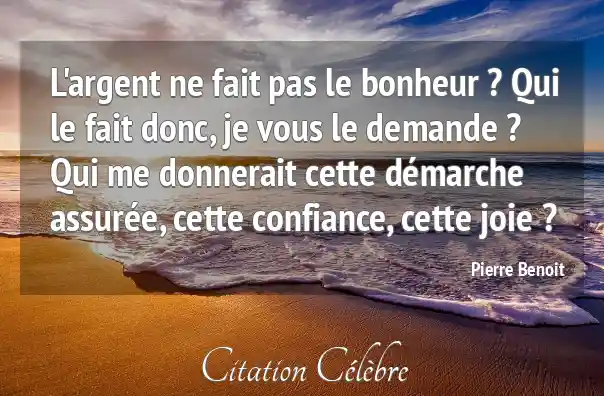 L'argent ne fait pas le bonheur ? Qui le fait donc, je vous le demande ? Qui me donnerait cette démarche assurée, cette confiance, cette joie ?