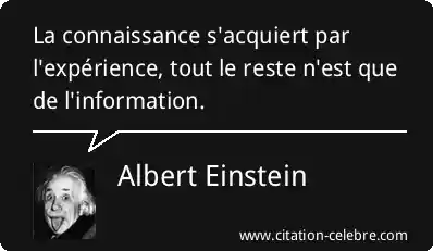 Cette célèbre citation d'Albert Einstein établit une distinction fondamentale entre la connaissance (ou savoir véritable) et la simple information. Pour Einstein, la véritable connaissance est celle qui est profondément assimilée et comprise grâce à la pratique, à l'expérimentation, et à la confrontation directe avec le réel. L'information, en revanche, est vue comme un ensemble de données, de faits ou de théories reçues passivement, qui n'a pas encore été éprouvé ou transformé par l'action et l'expérience personnelle.