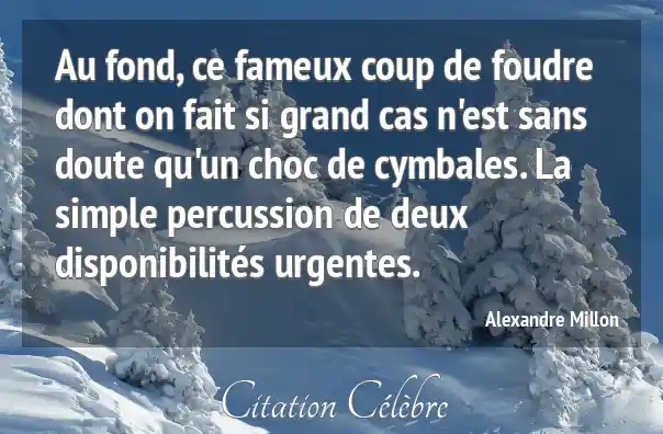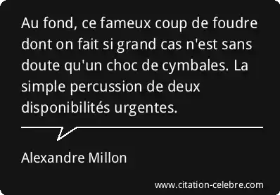 Au fond, ce fameux coup de foudre dont on fait si grand cas n'est sans doute qu'un choc de cymbales. La simple percussion de deux disponibilités urgentes.