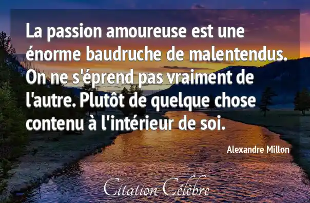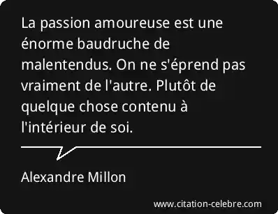 La passion amoureuse est une énorme baudruche de malentendus. On ne s'éprend pas vraiment de l'autre. Plutôt de quelque chose contenu à l'intérieur de soi.