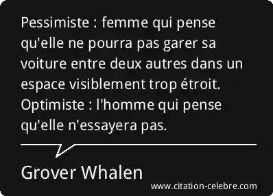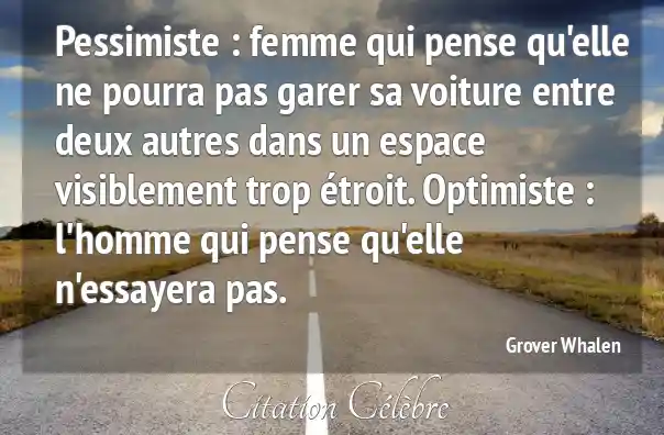 Pessimiste : femme qui pense qu'elle ne pourra pas garer sa voiture entre deux autres dans un espace visiblement trop étroit. Optimiste : l'homme qui pense qu'elle n'essayera pas.
