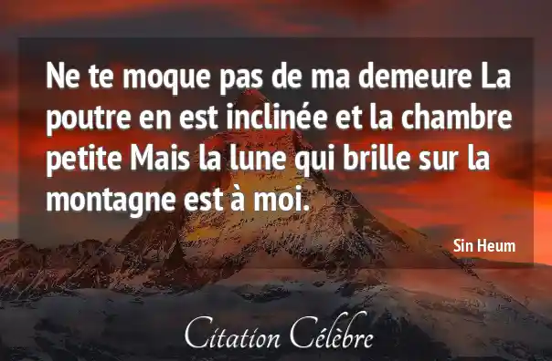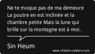 Ne te moque pas de ma demeure La poutre en est inclinée et la chambre petite Mais la lune qui brille sur la montagne est à moi.