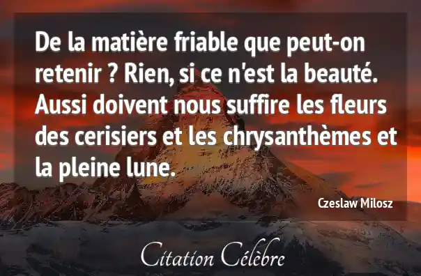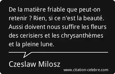 De la matière friable que peut-on retenir ? Rien, si ce n'est la beauté. Aussi doivent nous suffire les fleurs des cerisiers et les chrysanthèmes et la pleine lune.