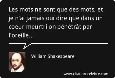 Les mots ne sont que des mots, et je n'ai jamais ouï dire que dans un coeur meurtri on pénétrât par l'oreille...