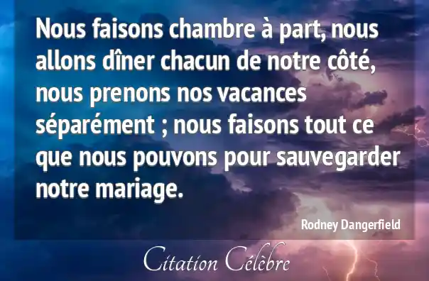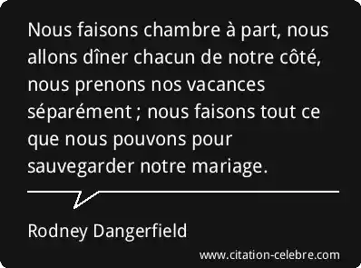 Nous faisons chambre à part, nous allons dîner chacun de notre côté, nous prenons nos vacances séparément ; nous faisons tout ce que nous pouvons pour sauvegarder notre mariage.