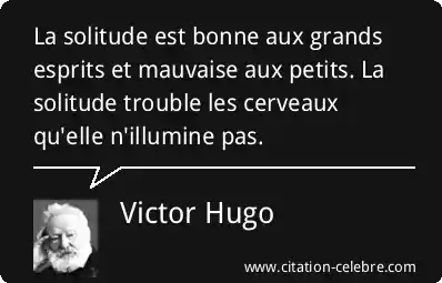 Cette citation de Victor Hugo exprime une dualité fondamentale de la solitude. Elle affirme que l'isolement est bénéfique pour les "grands esprits", agissant comme un catalyseur pour leur réflexion, leur créativité et leur illumination intérieure. En revanche, pour les "petits esprits", c'est une expérience néfaste, provoquant trouble, angoisse ou confusion, car ils ne parviennent pas à en tirer un enrichissement constructif. La solitude est un miroir qui amplifie ce que l'on porte déjà en soi : soit la lumière de la pensée, soit l'ombre du désarroi.