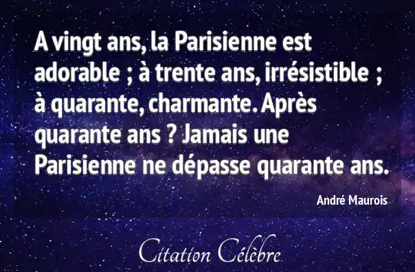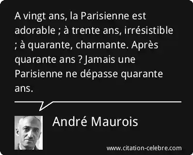 A vingt ans, la Parisienne est adorable ; à trente ans, irrésistible ; à quarante, charmante. Après quarante ans ? Jamais une Parisienne ne dépasse quarante ans.