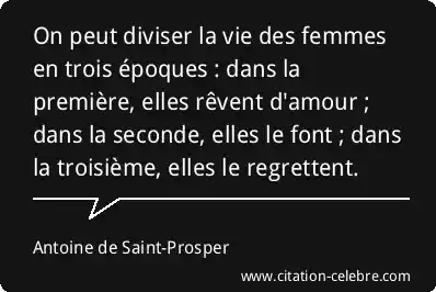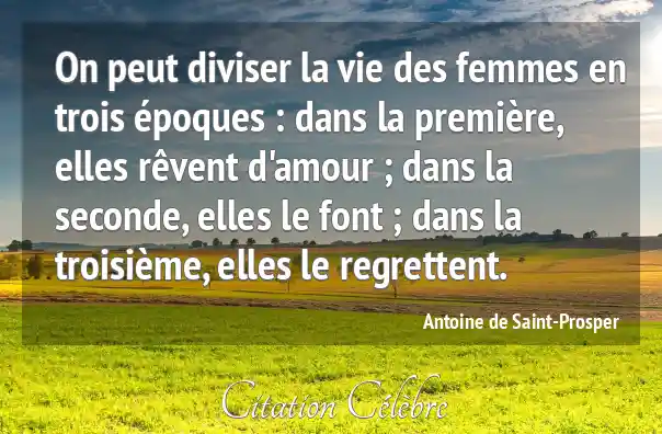 On peut diviser la vie des femmes en trois époques : dans la première, elles rêvent d'amour ; dans la seconde, elles le font ; dans la troisième, elles le regrettent.