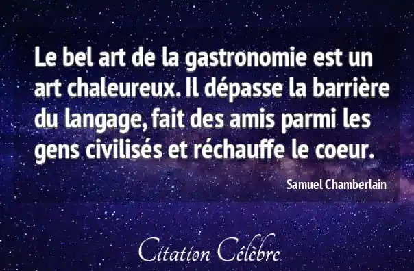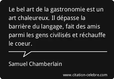 Le bel art de la gastronomie est un art chaleureux. Il dépasse la barrière du langage, fait des amis parmi les gens civilisés et réchauffe le coeur.