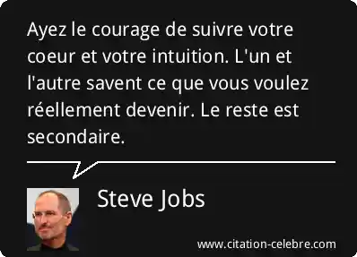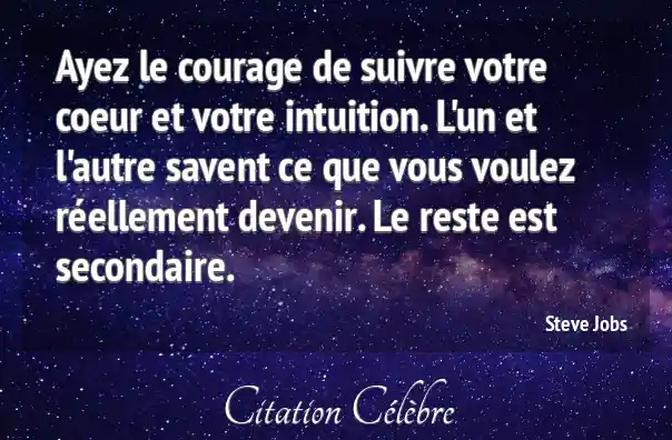 Ayez le courage de suivre votre coeur et votre intuition. L'un et l'autre savent ce que vous voulez réellement devenir. Le reste est secondaire.