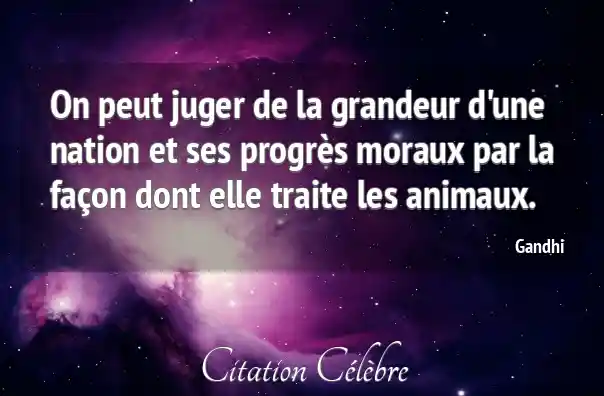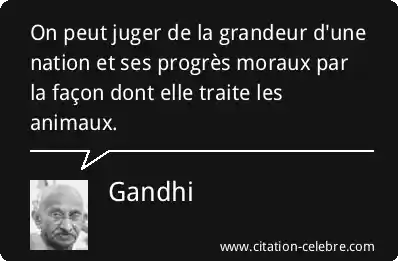 Cette célèbre citation de Gandhi signifie que la véritable valeur et le développement éthique d'une société ne se mesurent pas uniquement à sa puissance économique ou technologique, mais de manière significative à la façon dont elle se comporte envers les êtres les plus vulnérables, en l'occurrence, les animaux. Pour Gandhi, le traitement des animaux est un indicateur profond de la moralité collective et de la grandeur d'âme d'une nation.