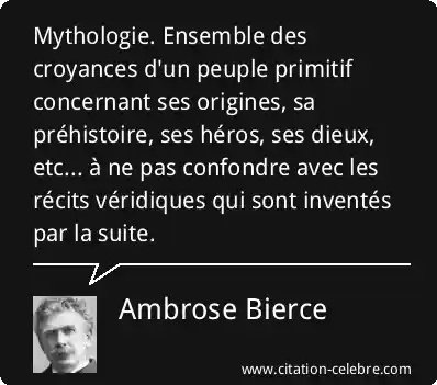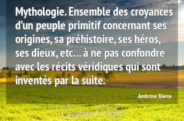 Mythologie. Ensemble des croyances d'un peuple primitif concernant ses origines, sa préhistoire, ses héros, ses dieux, etc... à ne pas confondre avec les récits véridiques qui sont inventés par la suite.