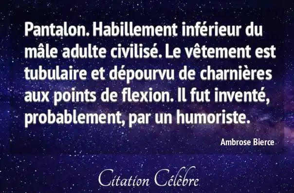 Pantalon. Habillement inférieur du mâle adulte civilisé. Le vêtement est tubulaire et dépourvu de charnières aux points de flexion. Il fut inventé, probablement, par un humoriste.