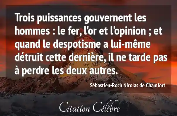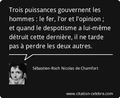 Trois puissances gouvernent les hommes : le fer, l'or et l'opinion ; et quand le despotisme a lui-même détruit cette dernière, il ne tarde pas à perdre les deux autres.
