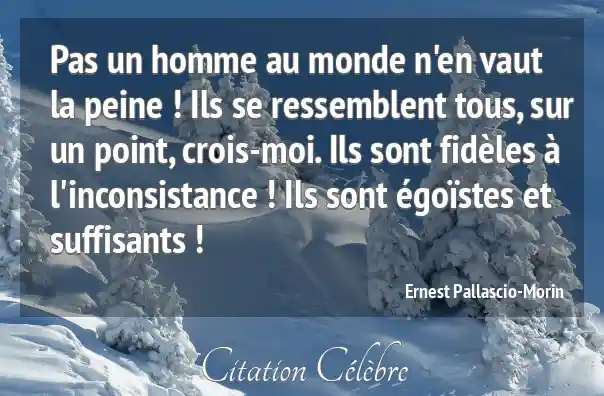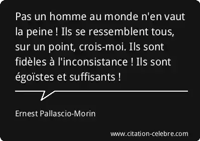 Pas un homme au monde n'en vaut la peine ! Ils se ressemblent tous, sur un point, crois-moi. Ils sont fidèles à l'inconsistance ! Ils sont égoïstes et suffisants !