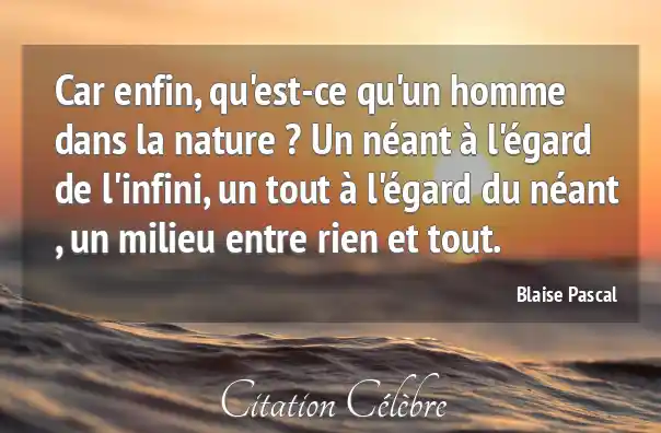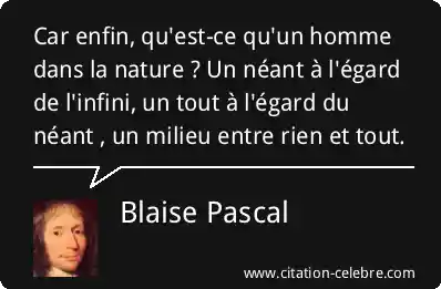 Car enfin, qu'est-ce qu'un homme dans la nature ? Un néant à l'égard de l'infini, un tout à l'égard du néant , un milieu entre rien et tout.