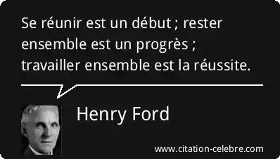 Cette citation d'Henry Ford établit une progression logique et croissante de l'effort collectif. Elle signifie que la simple action de se rassembler (le début) est la première étape nécessaire. L'étape suivante, plus exigeante, est de maintenir cette unité (le progrès). Enfin, la véritable valeur et l'atteinte des objectifs se trouvent dans la collaboration active (la réussite).