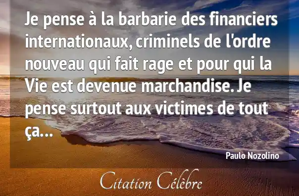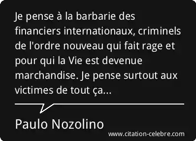 Je pense à la barbarie des financiers internationaux, criminels de l'ordre nouveau qui fait rage et pour qui la Vie est devenue marchandise. Je pense surtout aux victimes de tout ça...