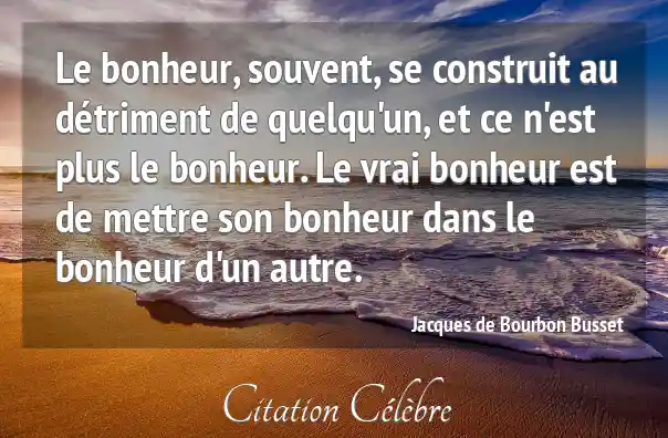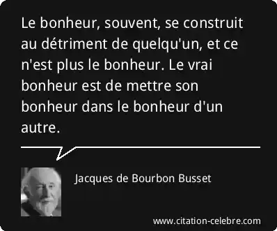 Le bonheur, souvent, se construit au détriment de quelqu'un, et ce n'est plus le bonheur. Le vrai bonheur est de mettre son bonheur dans le bonheur d'un autre.