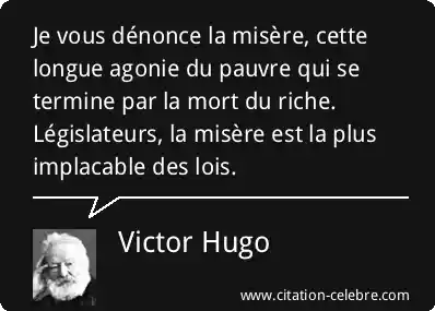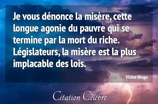 Je vous dénonce la misère, cette longue agonie du pauvre qui se termine par la mort du riche. Législateurs, la misère est la plus implacable des lois.