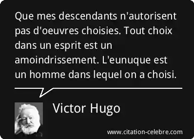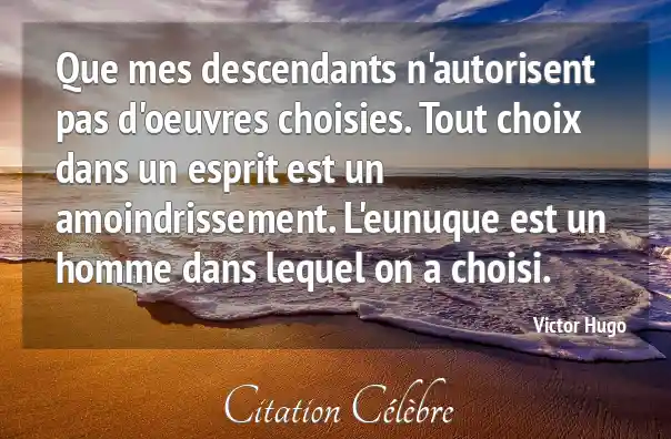 Que mes descendants n'autorisent pas d'oeuvres choisies. Tout choix dans un esprit est un amoindrissement. L'eunuque est un homme dans lequel on a choisi.