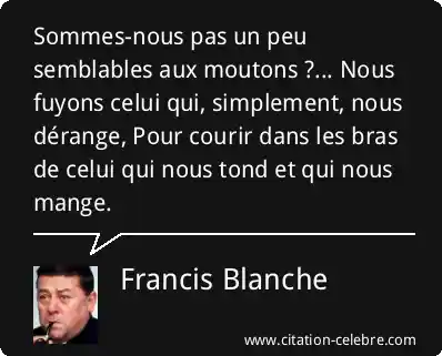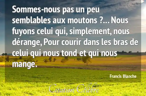 Sommes-nous pas un peu semblables aux moutons ?... Nous fuyons celui qui, simplement, nous dérange, Pour courir dans les bras de celui qui nous tond et qui nous mange.