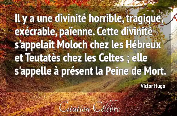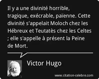 Il y a une divinité horrible, tragique, exécrable, païenne. Cette divinité s'appelait Moloch chez les Hébreux et Teutatès chez les Celtes ; elle s'appelle à présent la Peine de Mort.
