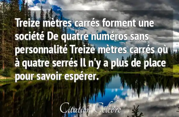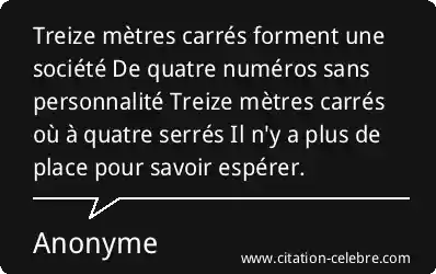 Treize mètres carrés forment une société De quatre numéros sans personnalité Treize mètres carrés où à quatre serrés Il n'y a plus de place pour savoir espérer.
