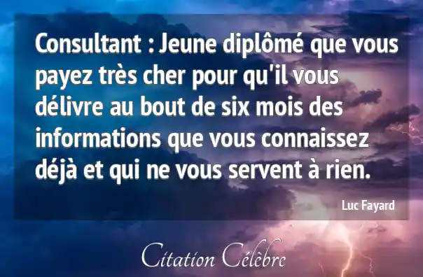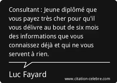 Consultant : Jeune diplômé que vous payez très cher pour qu'il vous délivre au bout de six mois des informations que vous connaissez déjà et qui ne vous servent à rien.