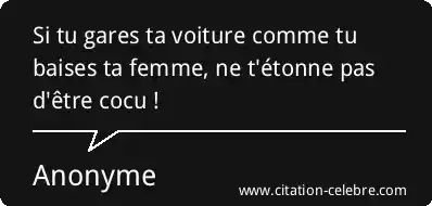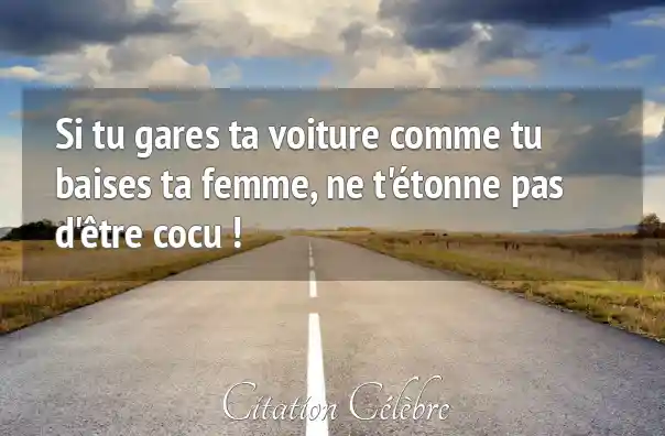 Cette citation, d'une tonalité à la fois crue et humoristique, établit une comparaison directe entre la manière dont une personne effectue une tâche banale (garer une voiture) et sa performance ou son attitude dans une sphère intime (sa relation conjugale et sexuelle). Elle suggère qu'un manque de soin, de précision, de respect des règles, ou une exécution médiocre dans une partie de sa vie se reflétera dans d'autres aspects, y compris les plus personnels. Le stationnement est utilisé comme métaphore de l'application, de l'attention aux détails et du respect de l'espace d'autrui.