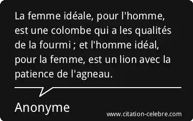 La femme idéale, pour l'homme, est une colombe qui a les qualités de la fourmi ; et l'homme idéal, pour la femme, est un lion avec la patience de l'agneau.