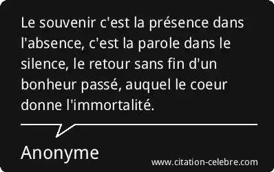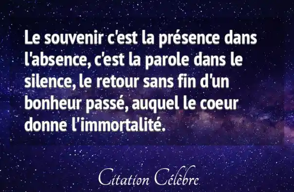 Le souvenir c'est la présence dans l'absence, c'est la parole dans le silence, le retour sans fin d'un bonheur passé, auquel le coeur donne l'immortalité.