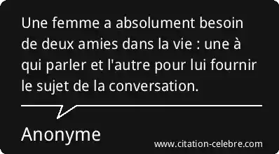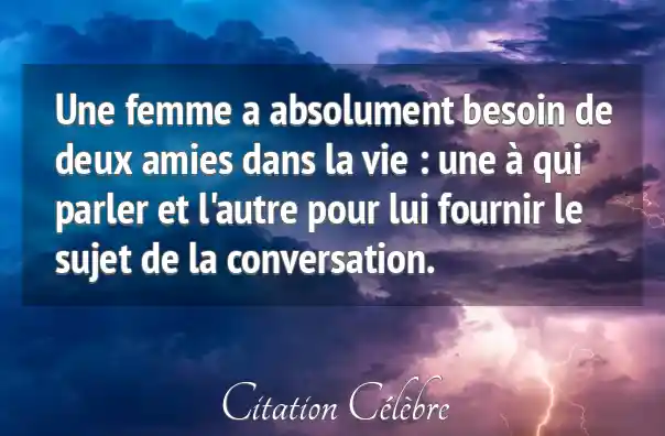 Une femme a absolument besoin de deux amies dans la vie : une à qui parler et l'autre pour lui fournir le sujet de la conversation.