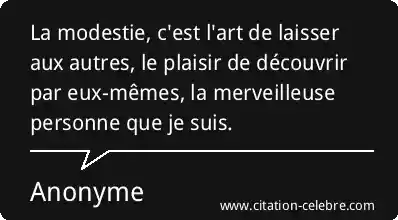 La modestie, c'est l'art de laisser aux autres, le plaisir de découvrir par eux-mêmes, la merveilleuse personne que je suis.