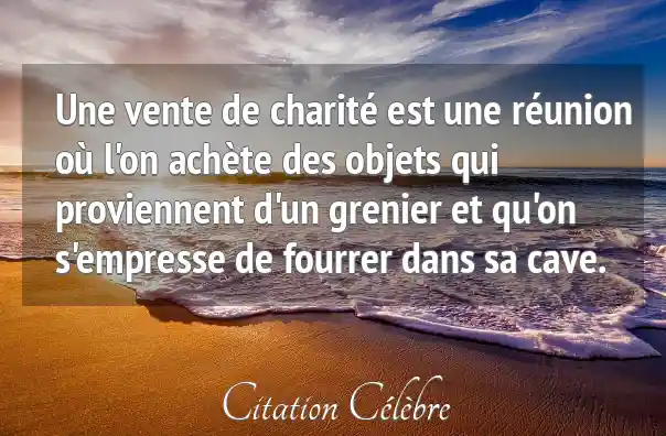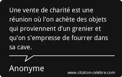Une vente de charité est une réunion où l'on achète des objets qui proviennent d'un grenier et qu'on s'empresse de fourrer dans sa cave.