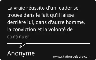 La vraie réussite d'un leader se trouve dans le fait qu'il laisse derrière lui, dans d'autre homme, la conviction et la volonté de continuer.