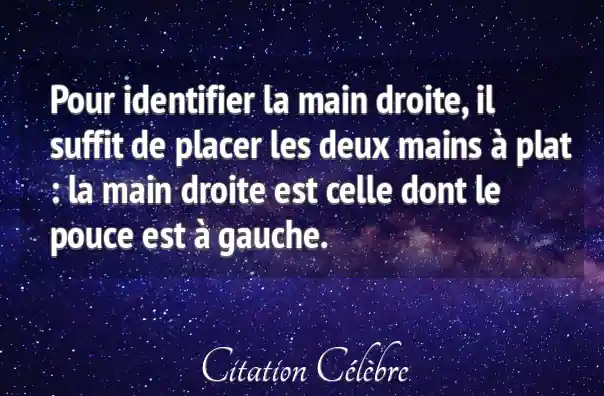 Pour identifier la main droite, il suffit de placer les deux mains à plat : la main droite est celle dont le pouce est à gauche.