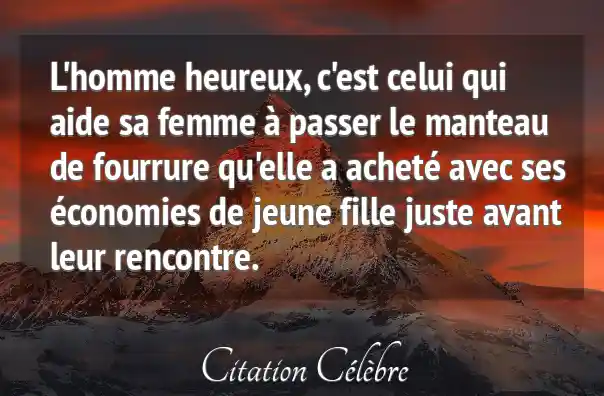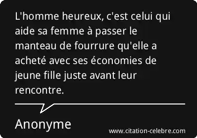 L'homme heureux, c'est celui qui aide sa femme à passer le manteau de fourrure qu'elle a acheté avec ses économies de jeune fille juste avant leur rencontre.