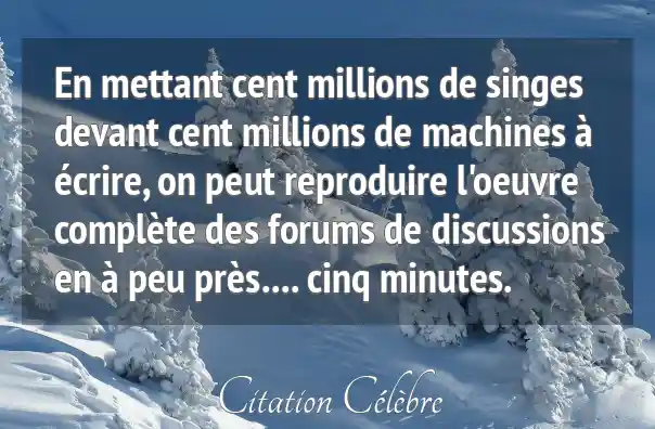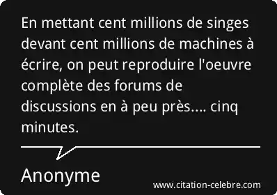 En mettant cent millions de singes devant cent millions de machines à écrire, on peut reproduire l'oeuvre complète des forums de discussions en à peu près.... cinq minutes.