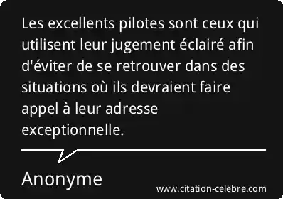 Les excellents pilotes sont ceux qui utilisent leur jugement éclairé afin d'éviter de se retrouver dans des situations où ils devraient faire appel à leur adresse exceptionnelle.