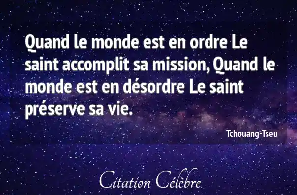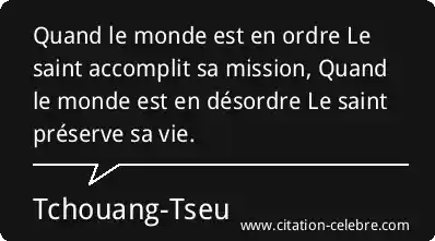 Quand le monde est en ordre Le saint accomplit sa mission, Quand le monde est en désordre Le saint préserve sa vie.