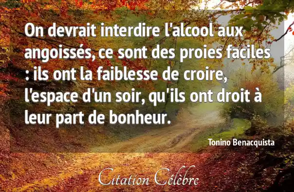 On devrait interdire l'alcool aux angoissés, ce sont des proies faciles : ils ont la faiblesse de croire, l'espace d'un soir, qu'ils ont droit à leur part de bonheur.