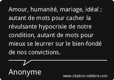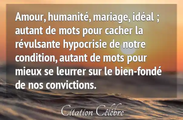 Amour, humanité, mariage, idéal ; autant de mots pour cacher la révulsante hypocrisie de notre condition, autant de mots pour mieux se leurrer sur le bien-fondé de nos convictions.