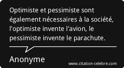 Optimiste et pessimiste sont également nécessaires à la société, l'optimiste invente l'avion, le pessimiste invente le parachute.