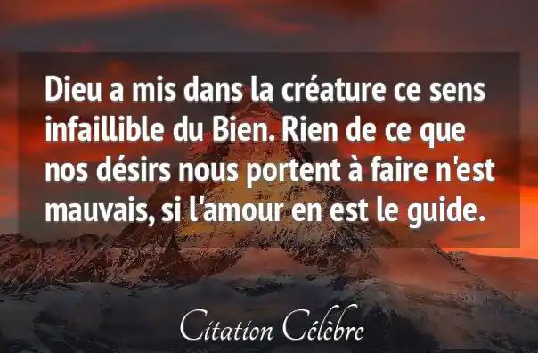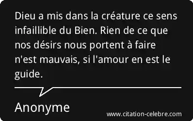 Dieu a mis dans la créature ce sens infaillible du Bien. Rien de ce que nos désirs nous portent à faire n'est mauvais, si l'amour en est le guide.