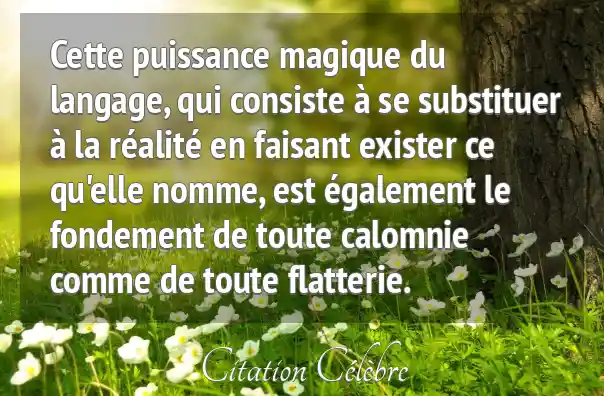 Cette puissance magique du langage, qui consiste à se substituer à la réalité en faisant exister ce qu'elle nomme, est également le fondement de toute calomnie comme de toute flatterie.